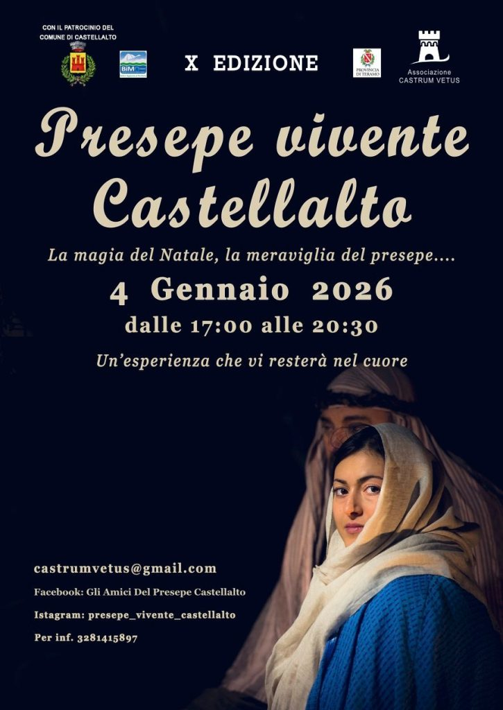 Importante l’evento “Presepe Vivente 2026 a Castellalto” che apre l’anno con la magia della natività domenica 4 gennaio ore 17.00, l’iniziativa giunge alla decima edizione e vedrà la partecipazione di un intero paese, un vero e proprio tuffo nella Betlemme di 2000 anni fa.