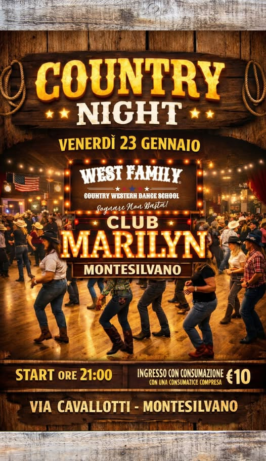 Per una serata decisamente originale e un po’ diversa dal solito…Venerdì 23 Gennaio a Montesilvano al CLUB Marilyn – Via Cavallotti (complesso ex Monti) , Nuova serata country dalle 21:00 Ingresso €10 con consumazione inclusa.